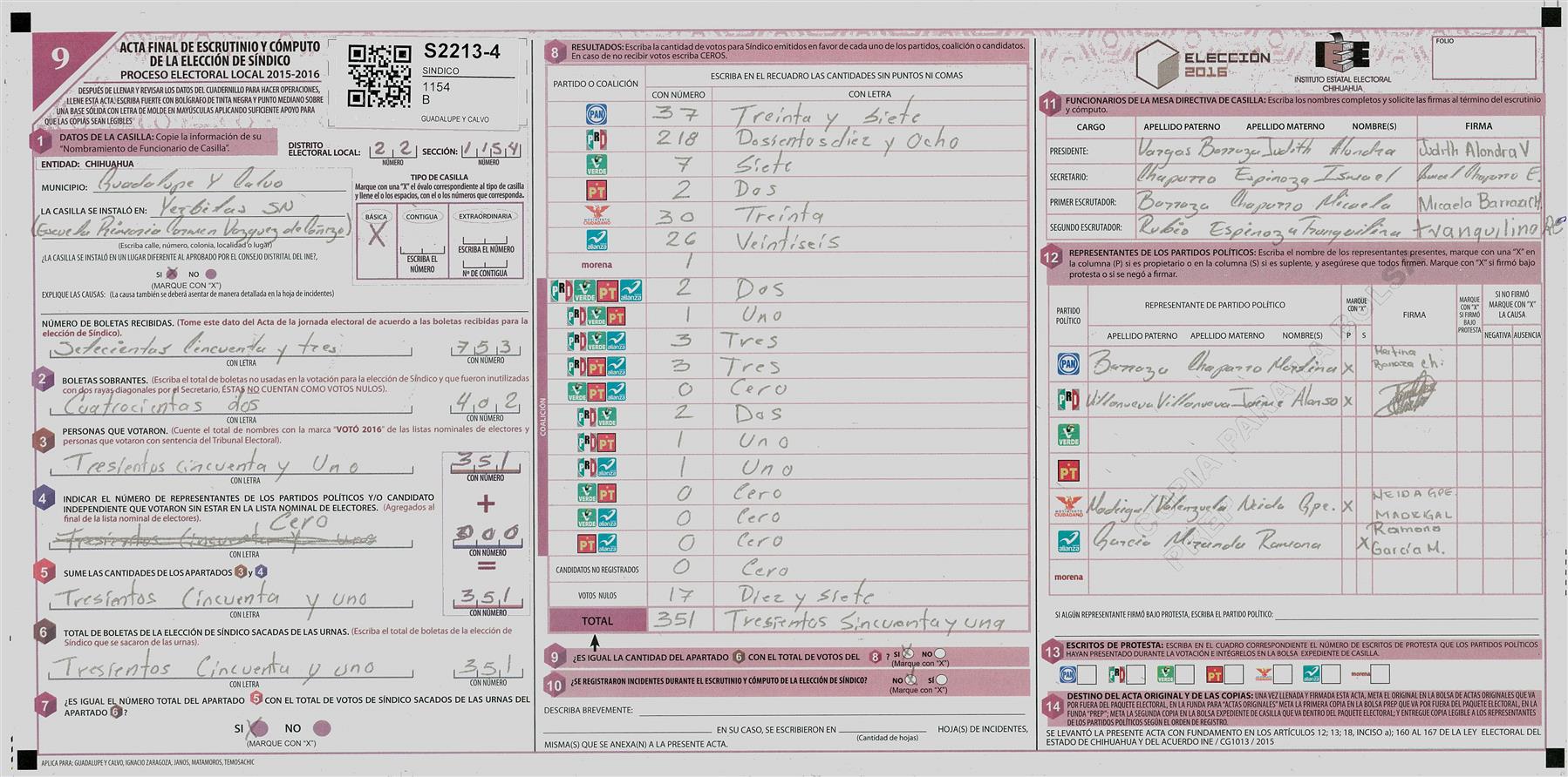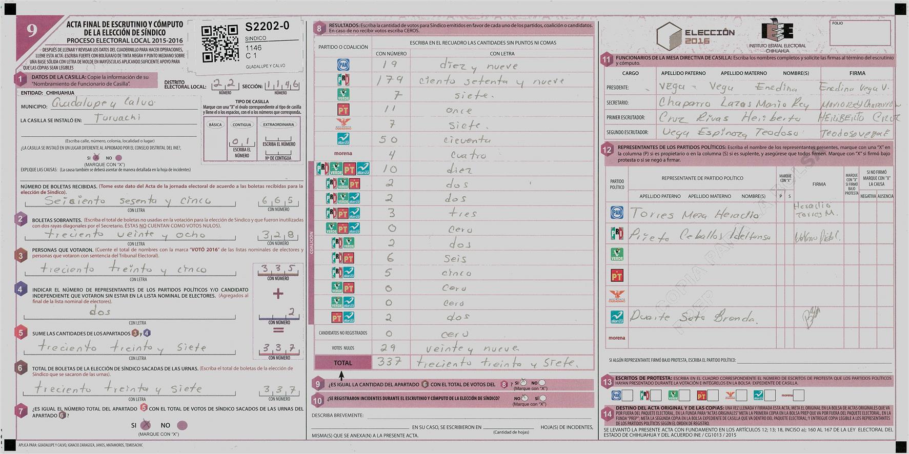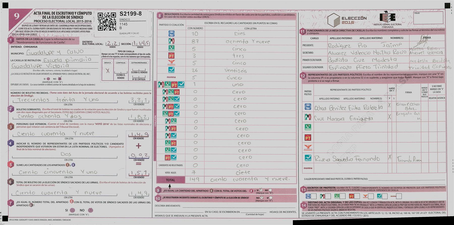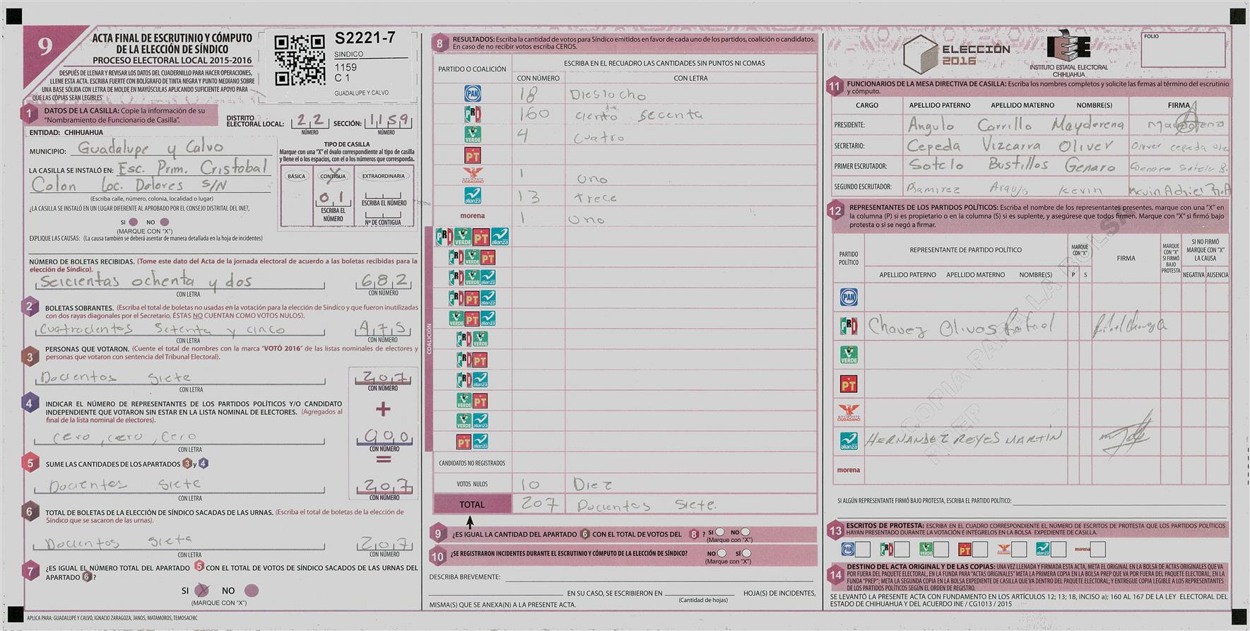 RESULTADOS POR CASILLA DEL MUNICIPIO DE GUADALUPE Y CALVO PARA LA ELECCIÓN DE SINDICO