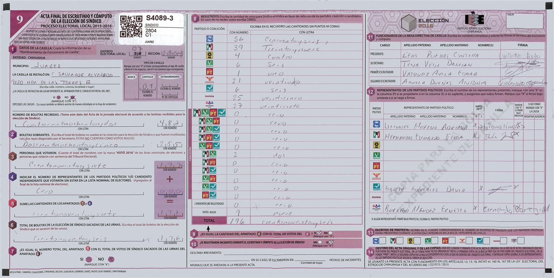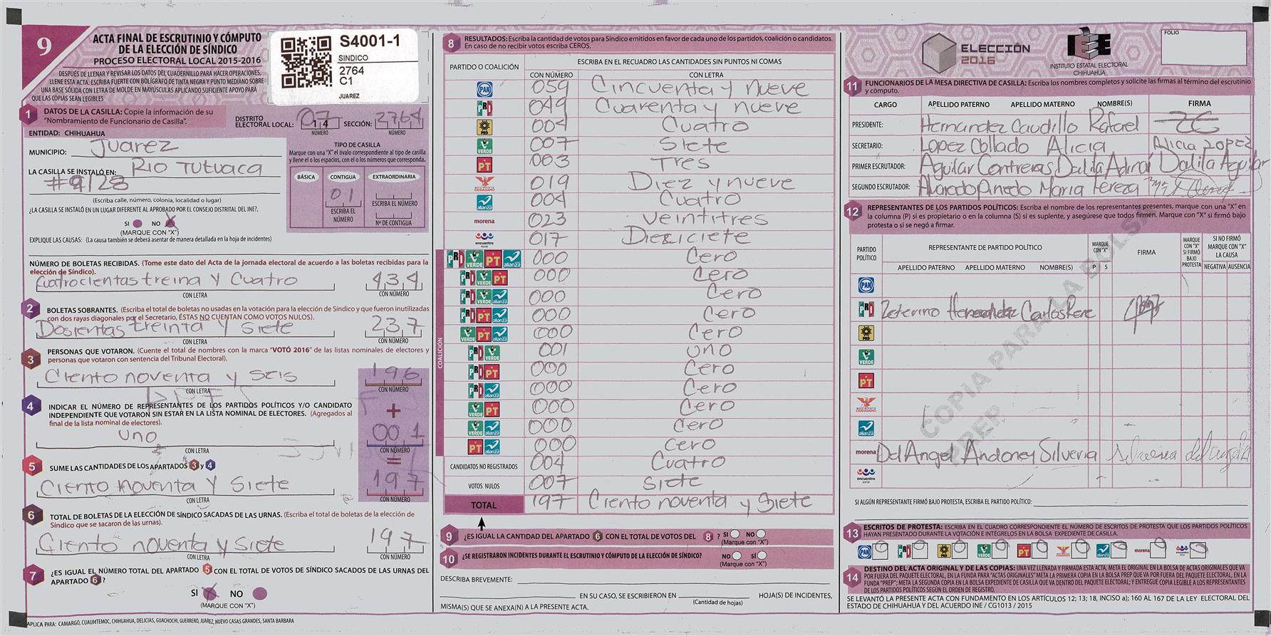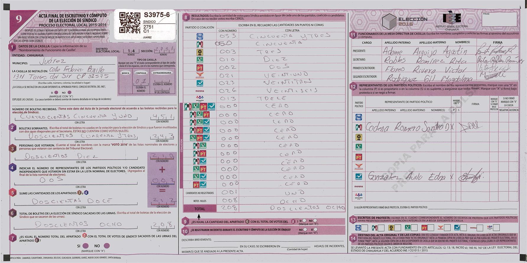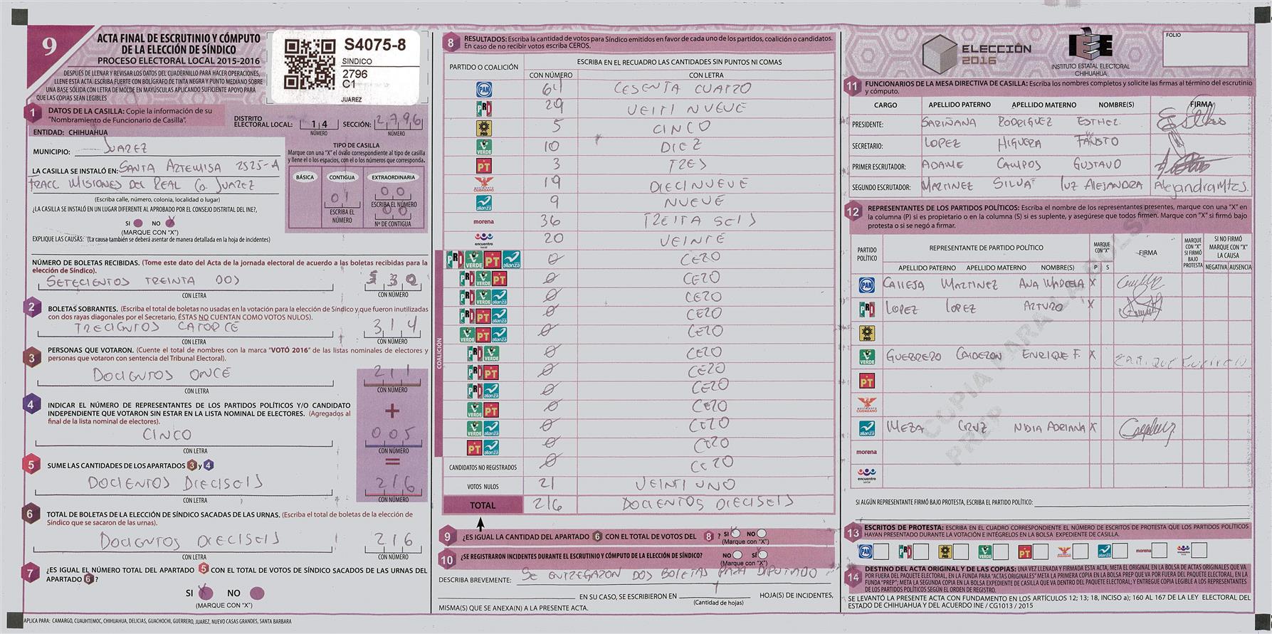 RESULTADOS POR CASILLA DEL MUNICIPIO DE JUAREZ PARA LA ELECCIÓN DE SINDICO