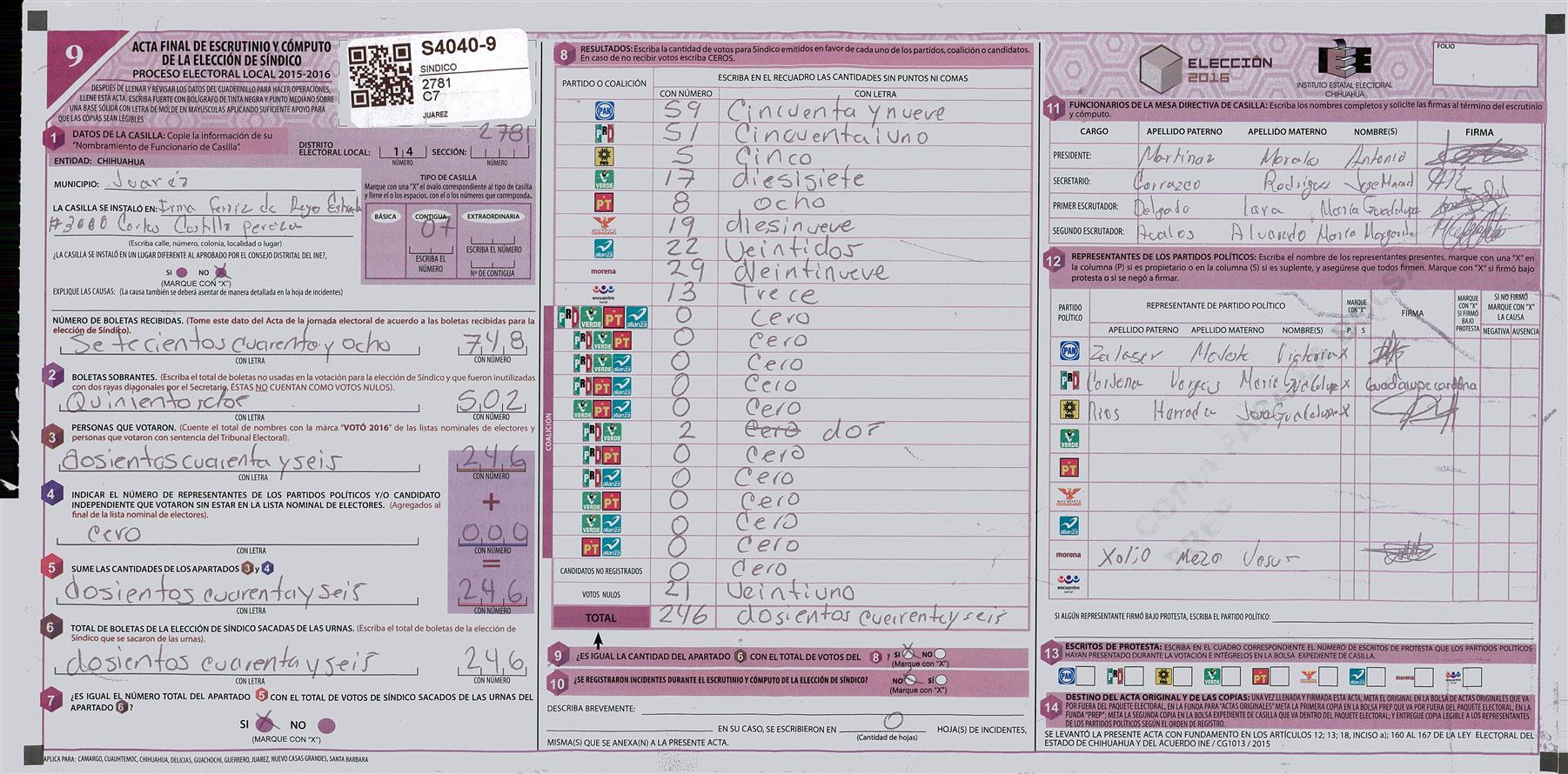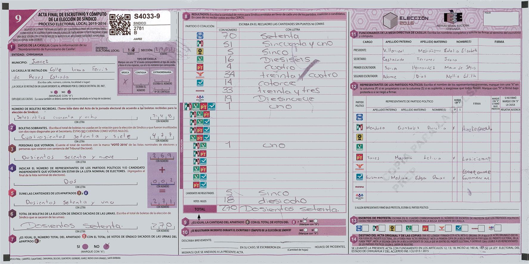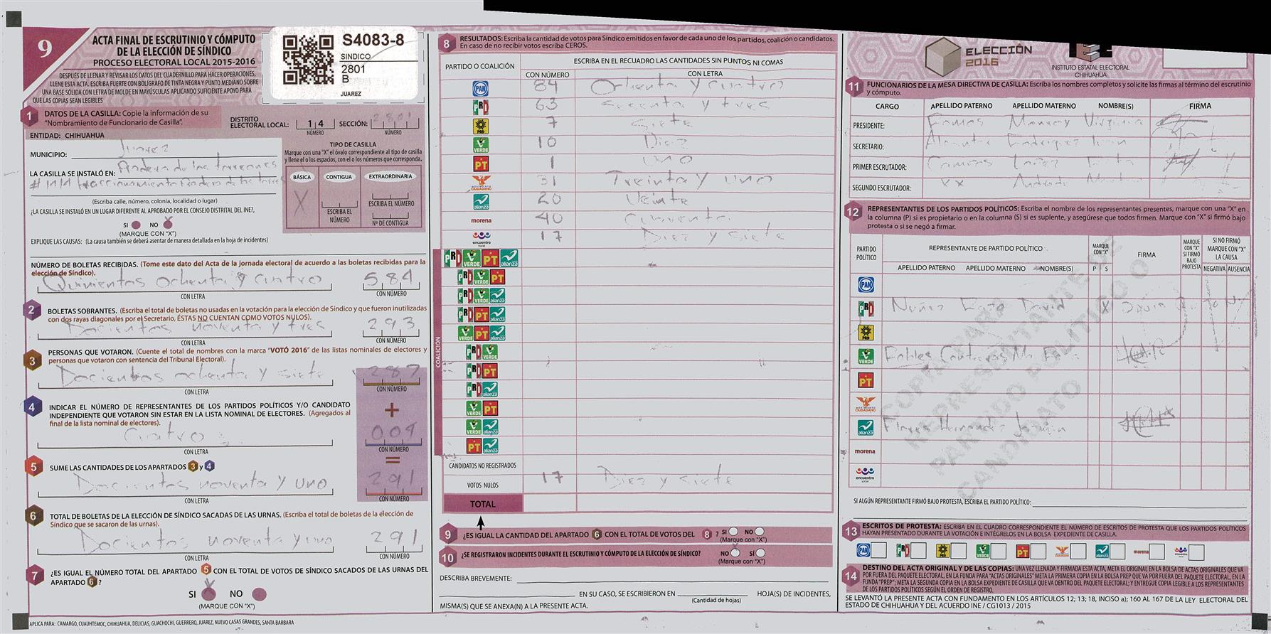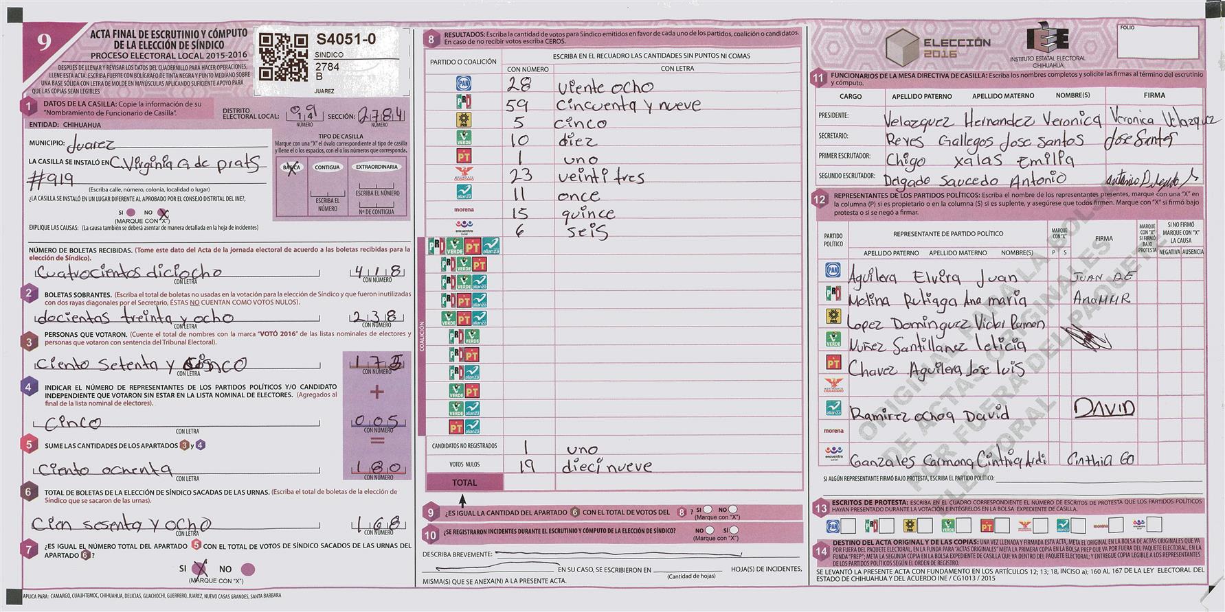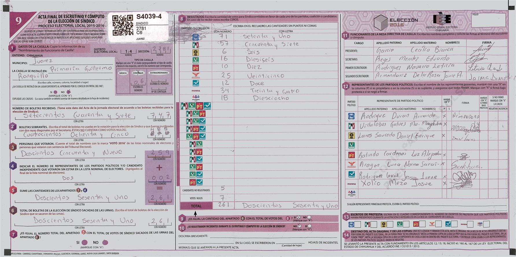 RESULTADOS POR CASILLA DEL MUNICIPIO DE JUAREZ PARA LA ELECCIÓN DE SINDICO