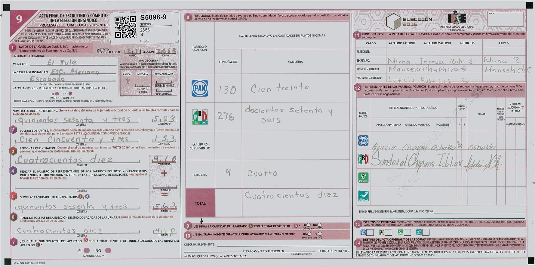 RESULTADOS POR CASILLA DEL MUNICIPIO DE EL TULE PARA LA ELECCIÓN DE SINDICO