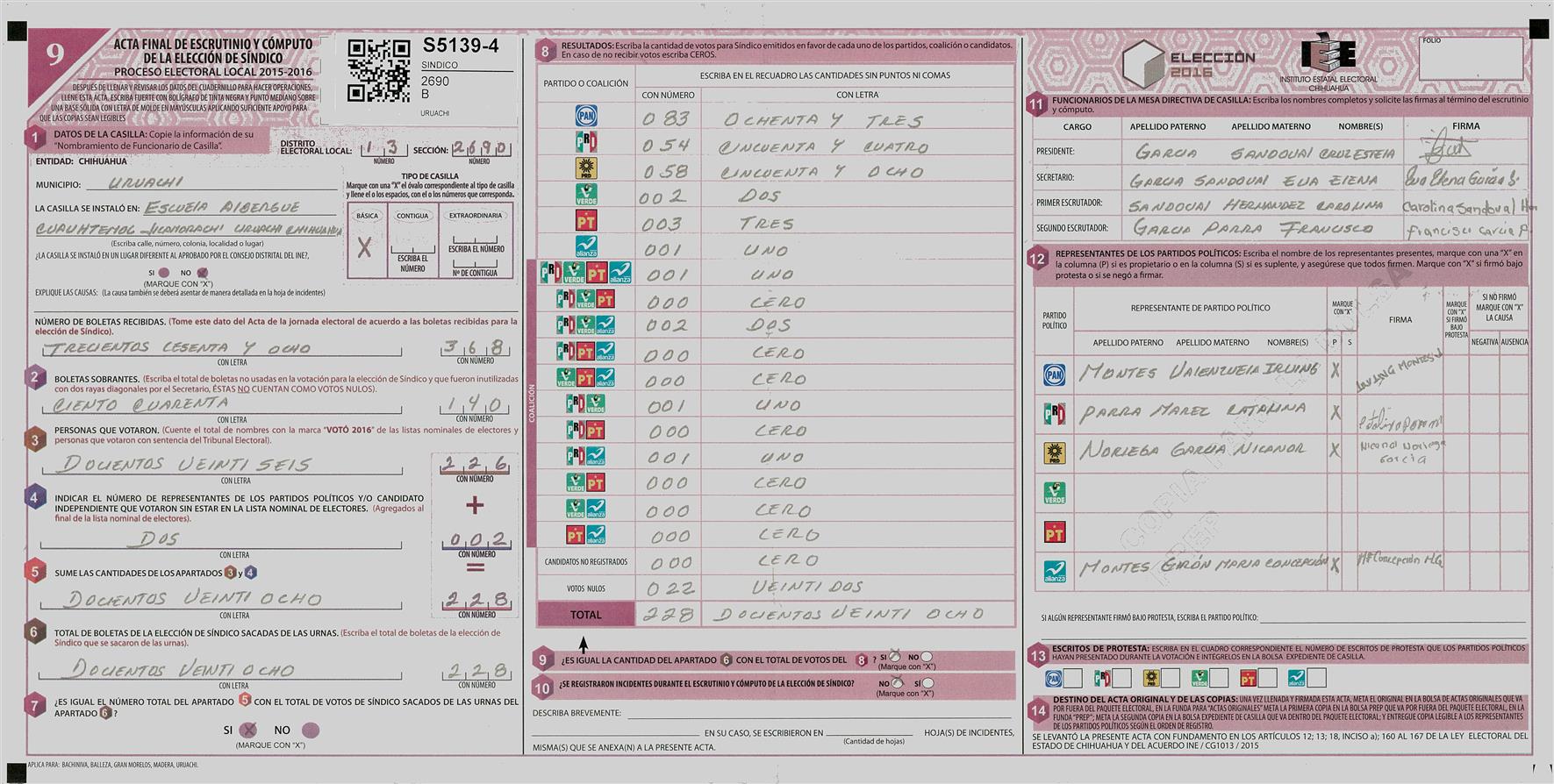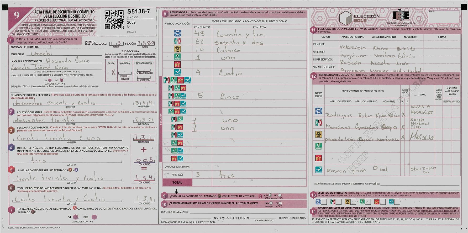 RESULTADOS POR CASILLA DEL MUNICIPIO DE URUACHI PARA LA ELECCIÓN DE SINDICO